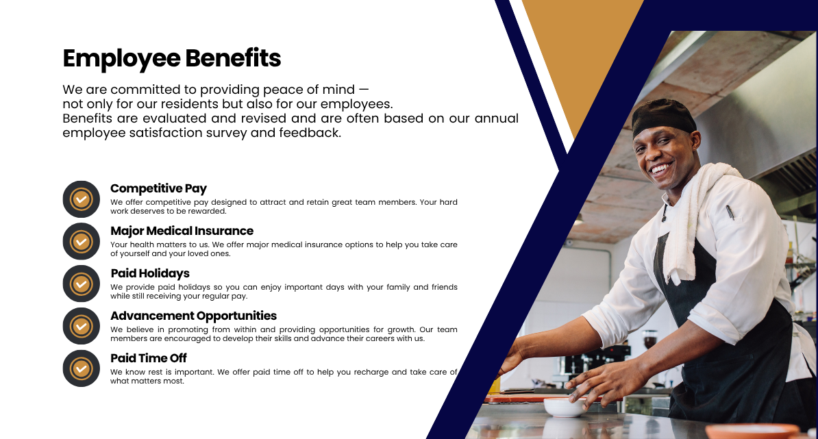 As a family-owned and operated company rooted in family values, we strive to provide superior service to our residents and support for our staff. As an integral part of our team, you will have the opportunity to learn and grow while making a meaningful difference in the lives of our residents and their families.